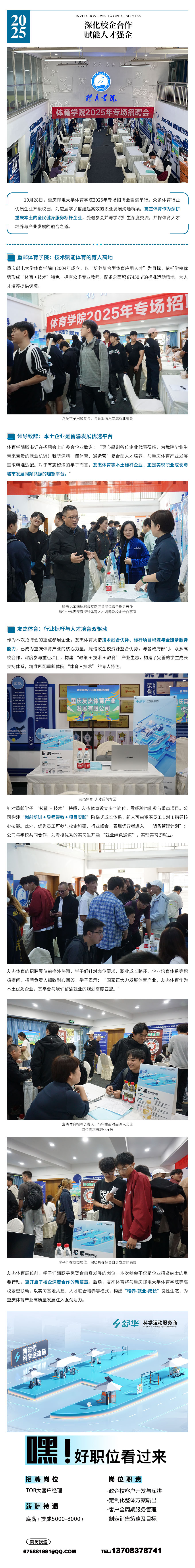 10月28日,重慶郵電大學體育學院2025年專場招聘會圓滿舉行。眾多體育行業優質企業齊聚校園,為應屆學子搭建起高效的職業發展溝通橋梁。友杰體育作為深耕重慶本土的全民健身服務標桿企業,受邀參會并與學院師生深度交流,共探體育人才培養與產業發展的融合之道。
