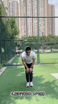 (二)活動關節: 1.頭部運動 2.肩部環繞 3.附身轉體模腳 4.弓步壓腿 5.側壓腿 6.膝關節屈伸 7.手腕腳踝