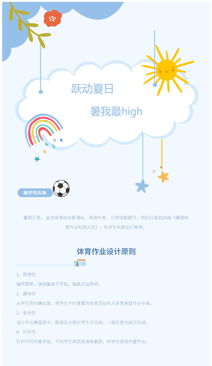 暑期已至,友杰體育結合新課標、體中考、日常體能提升,特別分享2024版《暑期體育作業標準示范》,供學生和家長們參考。